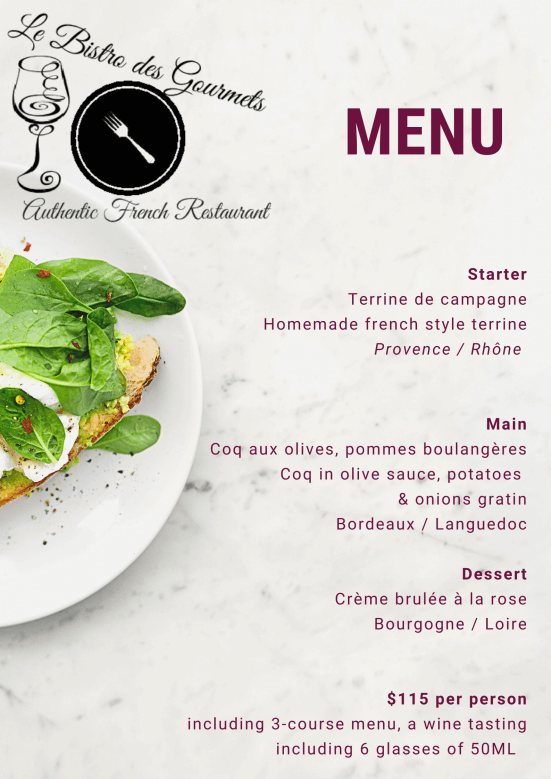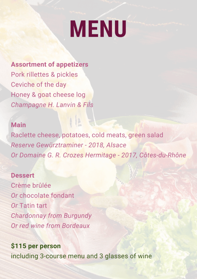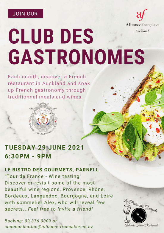 Please contact us for more information or for any dietary requirements: 09 376 0009 or information@alliance-francaise.co.nz