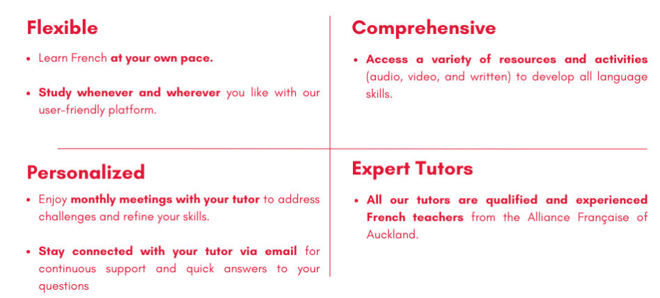 The Alliance Française Auckland caters to your needs by offering online self-learning paired with personalized guidance from a teacher!