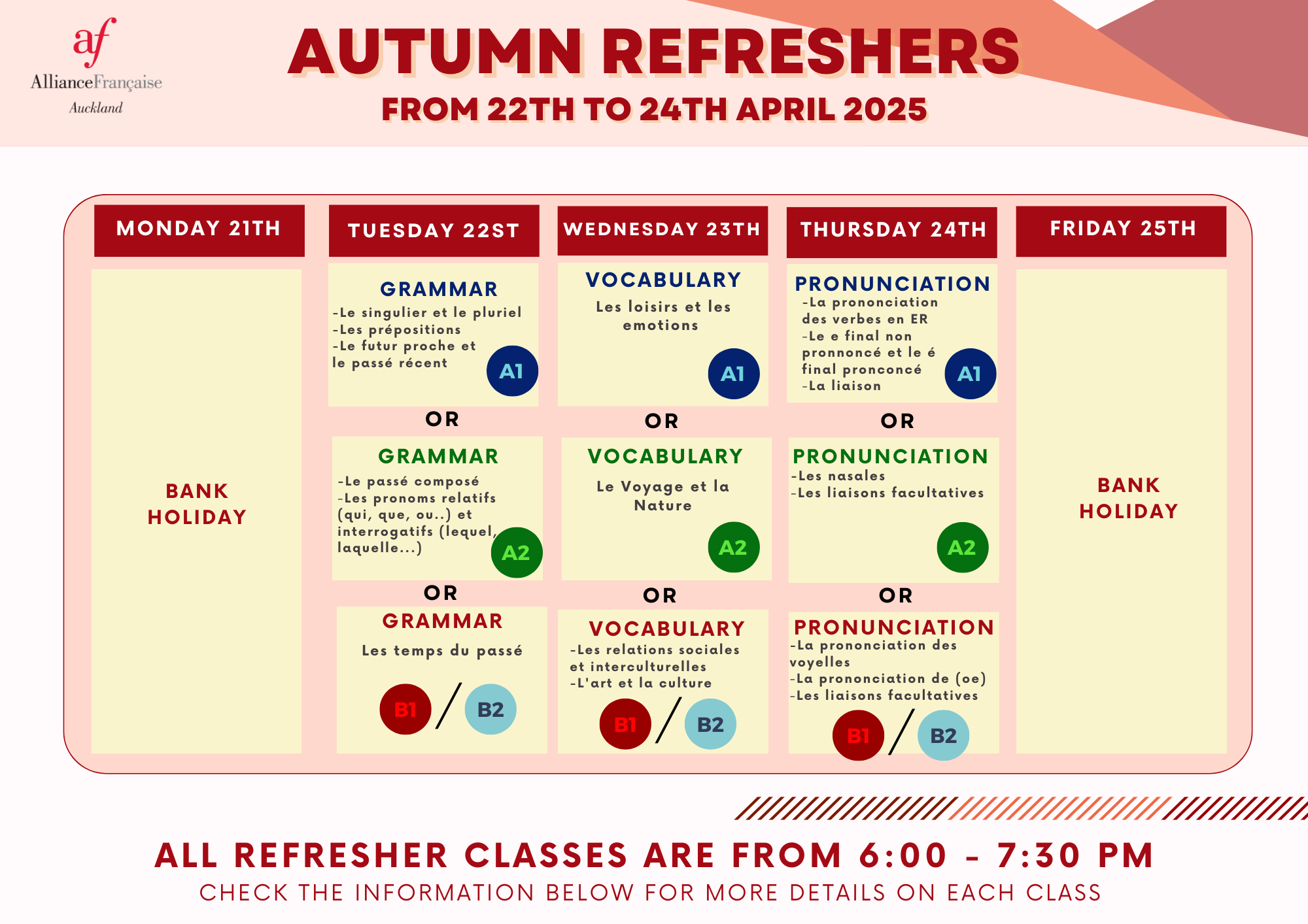 During school holidays Alliance Francaise organizes French refresher for each level in order to review all the important basis. So, before jumping to the next level, join our refresher courses to consolidate your basis in French depending on your needs!