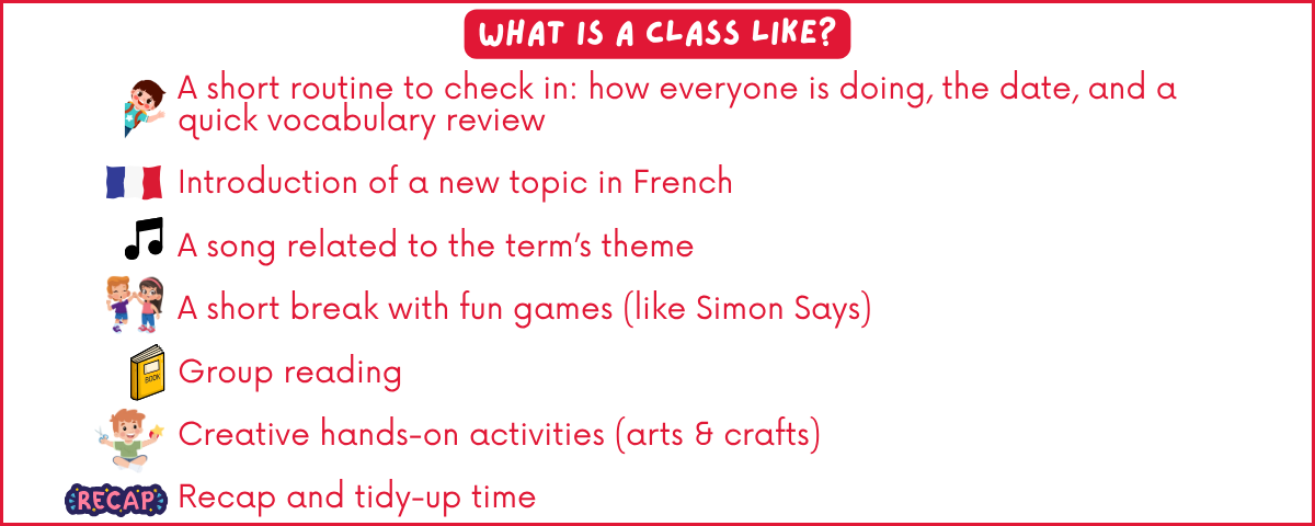 In a fun and relaxed environment, they naturally develop their French language skills while discovering new words, expressions, and aspects