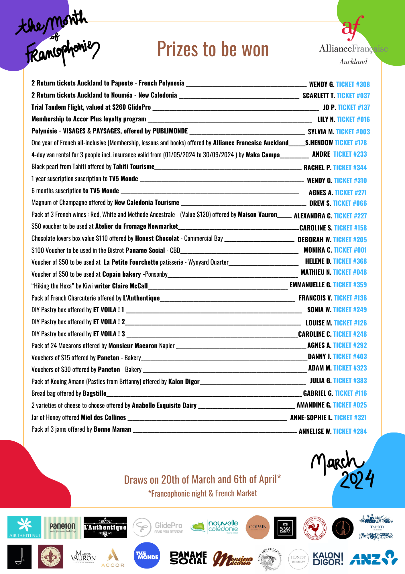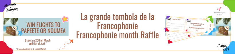 - The first will be on March 20 during the Francophonie Night, and 3 prizes will be drawn : 1 year of French courses at the Alliance Francaise Auckland, and the two return tickets to Nouméa and Pape'ete.